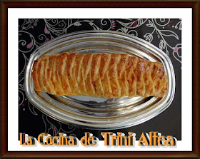 Cortamos el hojaldre hasta casi llegar al queso, dejando el centro sin tocar a un lado y al otro, encima ponemos la carne frita y hacemos la trenza, llevando la primera tira hacia el centro, después la de la otra parte y así sucesivamente hasta terminar con la ultima.